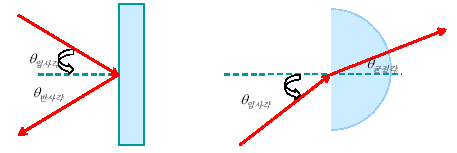 - 반사 : 평면 거울이 각도기판 중심을 지나고 각도기판에 수직이 되도록 세우고 입사광이 각도기 중심을 향하도록 한다.