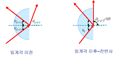 또한 임계각이 넘으면 전반사가 일어나는 것이 빛의 특징이다.