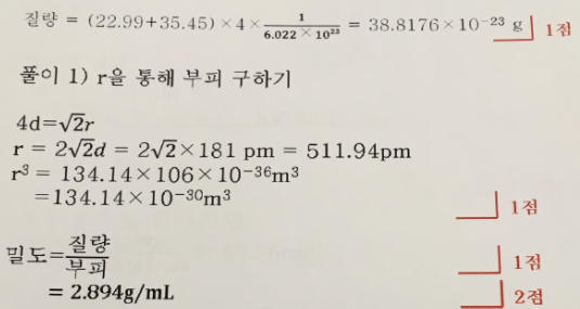(b) NaCl 결정의 밀도를 g/mL 단위로 구하라. (5점)