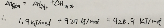 4. NaF의 용해엔탈피 △H용해 = +1.9kJ/mol이고 수화엔탈피 △H수화 = -927kJ/mol이다. 다음 과정의 엔탈피 변화를 구하라.