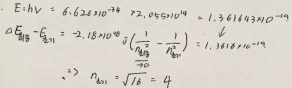 1. 어떤 들뜬 상태에 있는 수소 원자가 있다. 이 원자로부터 전자를 떼어 내어 이온화시키는 데 필요한 빛의 최소 진동수가 2.055x10^14 Hz이었다. 이 들뜬 수소 원자에 들어 있는 전자가 차지하고 있는 궤도함수의 주양자수 n값을 구하라.