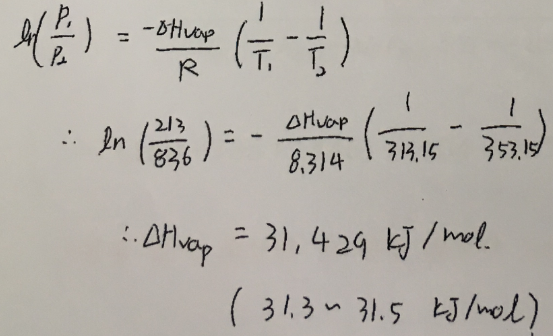 6. 40.0℃에서 사염화탄소(CCl4)의 증기압은 213torr, 80.0℃에서는 836 torr이다. 사염화탄소의 증발엔탈피를 kJ/mol 단위로 구하라.
