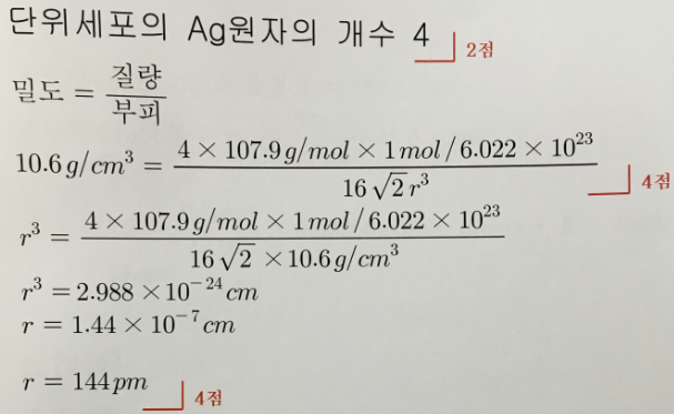 2. (10점) 은의 결정 구조는 입방 최조밀 쌓임 구조이며 밀도는 10.6g/cm^3이다. 은 원자의 반지름을 pm 단위로 구하라.