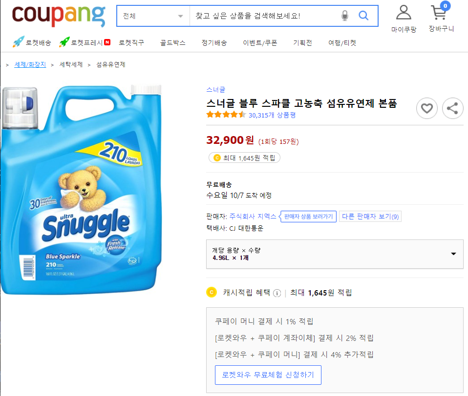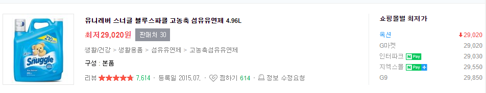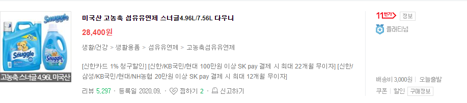 " 스너글 4.96L 1개당 28000~29000원이 평소 최저가입니다. (배송비 3000원 별도) "