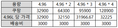 저는 4.96L 1개를 구매하는 것을 고려하고 있어 32900원을 기준으로 보겠습니다.
