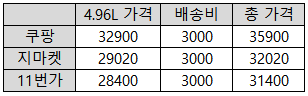 결국 4.96L 1개를 구매하기에 저렴한 가격은 28400원 + 3000원 = 31400원 정도의 돈이 든다고 생각할 수 있습니다.