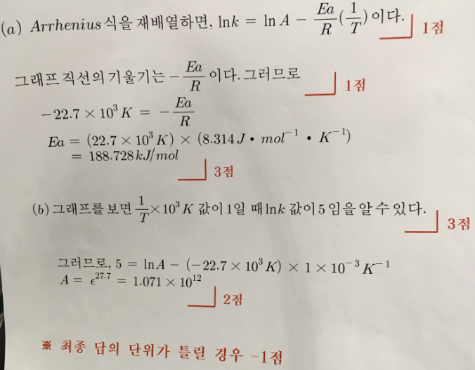 a. 이 반응의 활성화 에너지를 kJ/mol 단위로 구하시오. (5점)