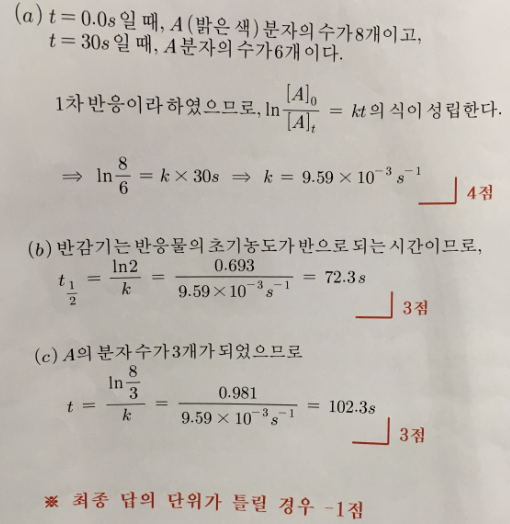 b. 반응의 반감기 t1/2를 구하라. (3점)