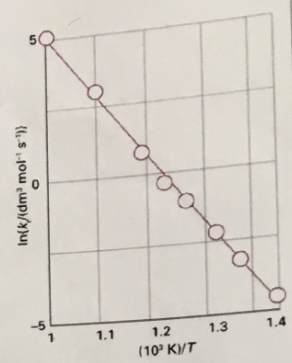 4. (10점) 그림은 어떤 반응의 속도 상수에 대한 Arrhenius 도시이다. 이 그래프의 직선의 기울기는 -22.7 x 10^3K이다. 다음 물음에 답하라. 이 그래프의 dm^3 = L이다.