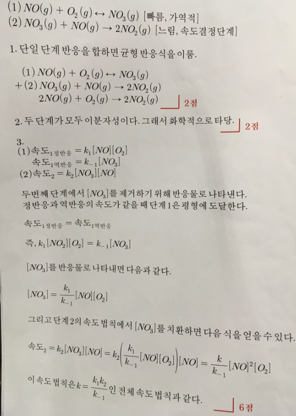 3. (10점) 2NO(g) + O2(g) → 2NO(g), 속도 = k[NO]^2 [O2]