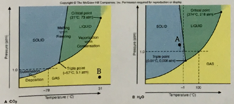 ② 점 B의 상태에 있는 이산화탄소의 압력을 일정하게 유지하면서 온도를 낮추면 액체를 거치지 않고 고체로 변한다.