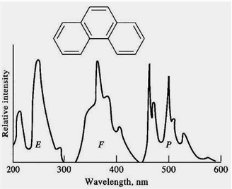 (4)(8점) phenanthrene의 excitation, fluorescence, phosphorescence spectra은 옆과 같이 얻어진다. 각 spectra의 파장 영역대가 서로 다른 곳에서 나타나는 이유를 설명하시오.