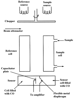 (7)(10점) 옆 그림은 CO 가스 검출용 비분산형 적외선 광도계이다. 그림을 참조하면서 복잡한 기체를 포함한 시료 중 어떻게 CO 농도만을 분석하는지 설명하시오.
