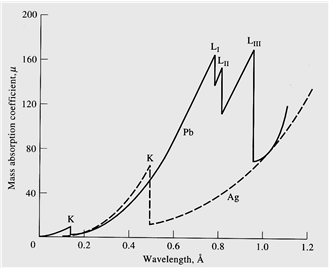 (5) 옆의 그림은 납과 은의 X-선 흡수 스펙트럼을 보여주고 있다. mass absorption coefficient, K, L 표현들이 무얼 말하는지, 왜 흡수 스펙트럼이 파장에 따라 옆 그림처럼 나오는지 설명하시오.