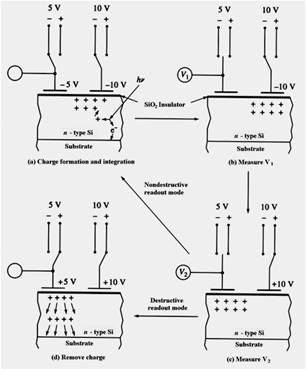 (9)(10점) 옆 그림은 chaege-injection device(전하-주입 장치)의 cycle을 보인 것이다. 4개의 부분 그림들이 무엇을 하는 것인지 설명하시오.