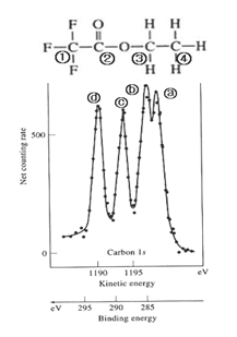 (9)(8점) 옆그림은 ethyl trifluoroacetate의 C 1s의 XPS spectrum이다. 각 탄소(번호로 구별하였음)에 해당하는 XPS peak(a-d로 구별하였음)를 짝 짓고, XPS에서 이와같이 chemical shift(화학적 이동)이 일어나는 이유를 설명하시오.