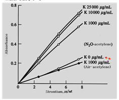 (4)(9점) 옆 그림은 다양한 농도의 K를 첨가하였을 때의 원자흡수분광법에서의 Sr의 검정곡선이다. 첨가한 K 농도가 커질수록 Sr의 검정감도가 증가하는 이유는 무엇인가? 또, N2O-acetylene 불꽃에서 air-acetylene에서 보다 더 감도가 높은 이유는 무엇인가?