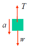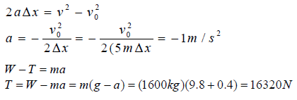 4-14. 짐을 실은 승강기의 총 질량이 1,600 kg이다. 초속도 2.0 m/s로 내려오던 승강기가 어느 순간부터 일정한 가속도로 감속하여 5.0 m 더 간 후 정지하였다. 정지하기까지 승강기를 연결한 줄의 장력은 얼마인가? (단, g = 9.8 m/s2이다.)