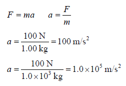 4-2. 100 N의 힘을 1.00 kg과 1.00 g에 각각 가했을 때, 각 물체의 가속도는 얼마인가?