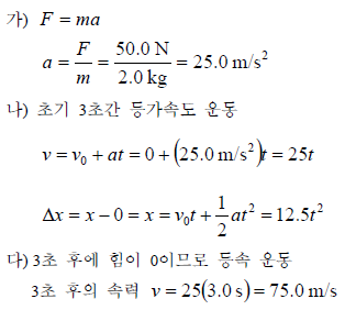 4-3. 마찰을 무시할 수 있는 수평트랙 위에 정지해 있던 2.00kg 물체에 50.0N의 힘을 수평방향으로 3.0초 동안 가했다. 이후 물체는 직선운동을 한다. 다음을 구하여라.