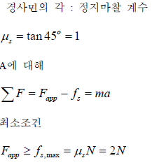 4-8. 아래 그림 A와 같이 널빤지 위에 무게 2 N인 상자가 놓여 있다. 이제 널빤지를 B와 같이 기울여 지면과 45o의 각도를 이룰 때, 상자가 미끄러지기 시작하였다. 널빤지가 지면과 나란한 A의 상황에서 상자를 움직이는 최소 힘은 얼마인가?