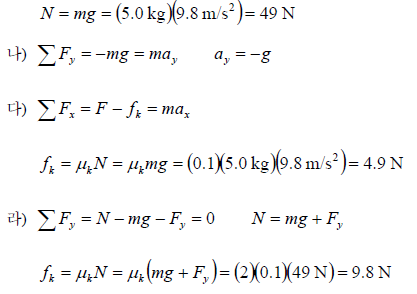 (라) 친구가 이 물체 위를 힘 49.0N으로 누를 때, 운동마찰력을 구하고 결과를 (다)와 비교하여라.풀이) y축 평형