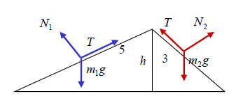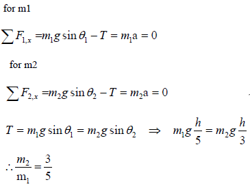 5-16. 경사면 길이의 비가 5 : 3인 두 경사면이 그림과 같이 서로 마주보고 있다. 두 경사면 위에는 물체 (가)와 (나)가 끈으로 연결되어 평형을 유지하고 있다. 물체 (나)의 질량은 (가)의 질량의 몇 배인가?