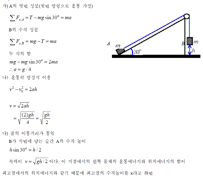 (다) 왼쪽의 물체는 수직 방향으로 최고 얼마만큼 올라가겠는가?(주의: 오른쪽 물체가 지면에 닿아 정지한 이후에도 왼쪽 물체는 계속 움직일 수 있다.)