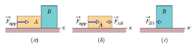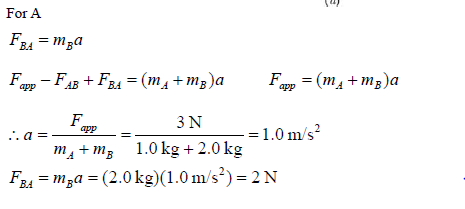 4-12. 마찰이 없는 책상 위에 두 물체가 그림과 같이 서로 접촉해 있다. 두 물체의 질량은 각각 2.0 kg과 1.0 kg이다. 3.0 N의 힘을 1.0 kg 물체에 수평으로 작용시킬 때,