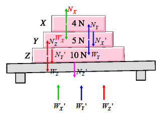 4-5. 세 권의 책(X, Y, Z)이 책상 위에 놓여 있다. X의 무게는 4 N, Y의 무게는 5 N, Z의 무게는 10 N이다.
