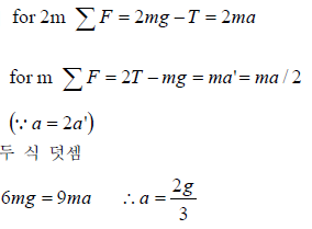 4-19. 아래 그림에서 질량 2m인 물체의 하향 가속도의 크기를 중력가속도 g로 나타내어라. (단, 도르래 질량은 무시한다.)